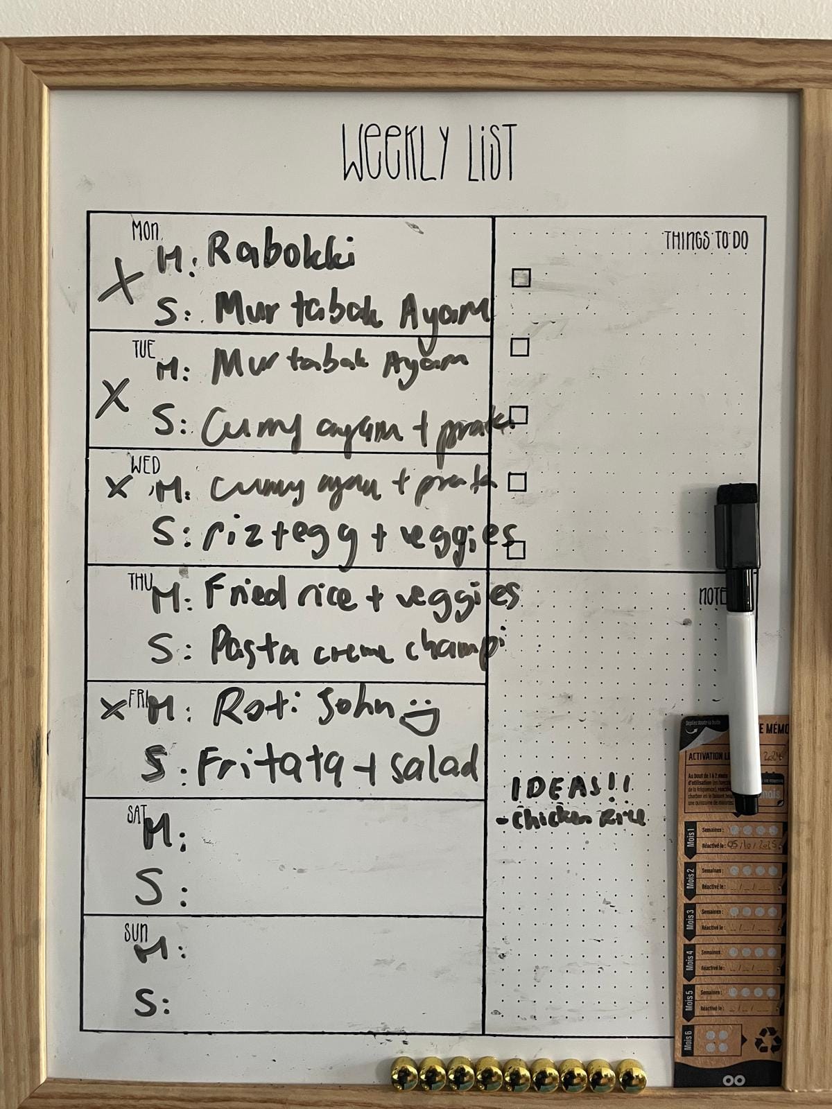 My husband and I plan our meals for the week ahead. A typical week could look like this: